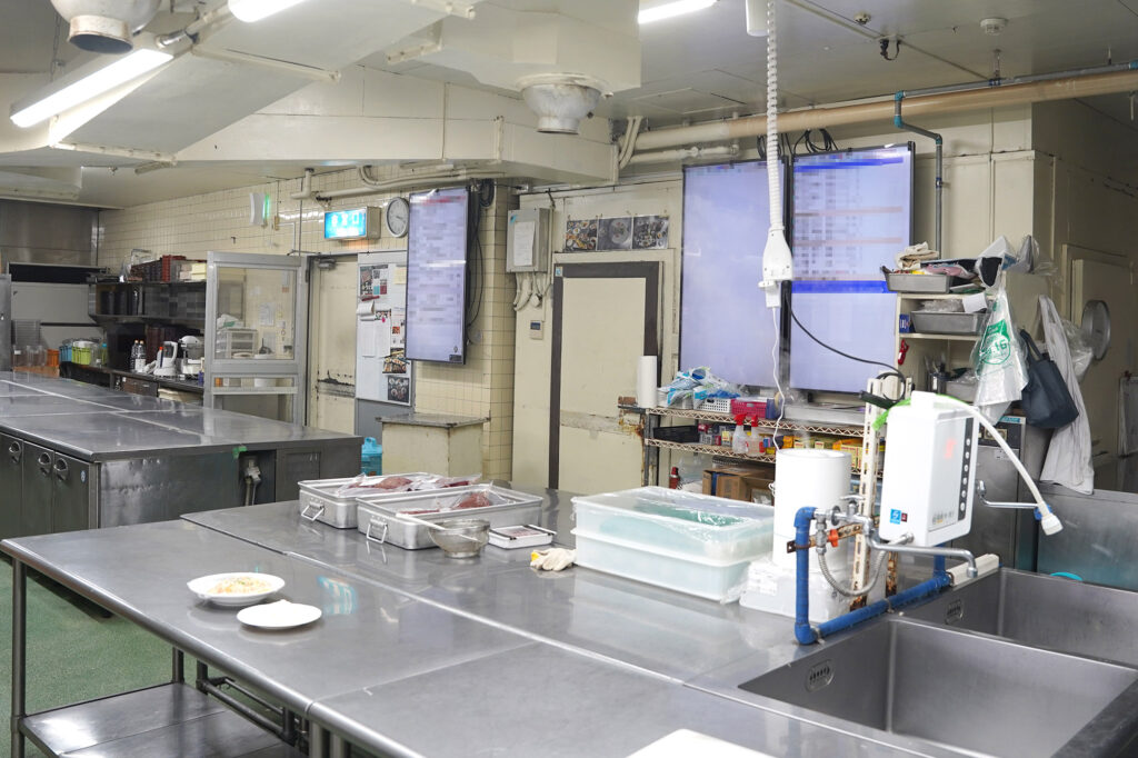 調理場にはサイネージを設置し、宿泊客数をリアルタイムで確認できるようにすることで、必要な量を仕入れ、適切に調理しています。