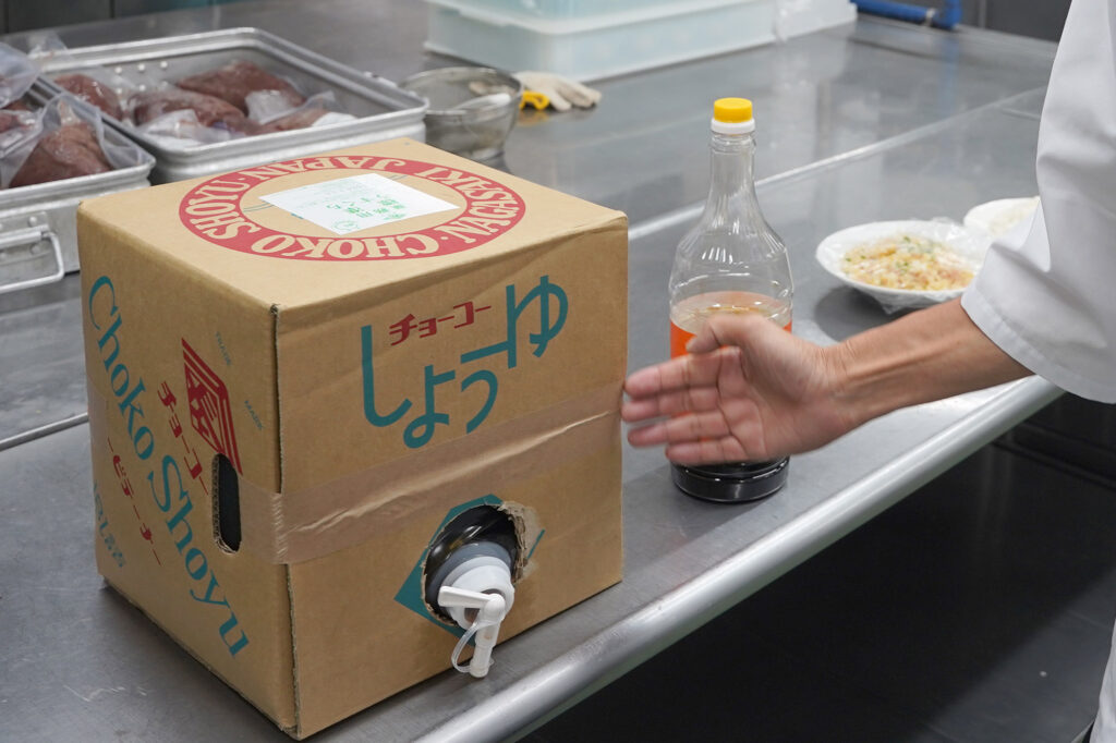 調味料のペットボトル削減です。しょうゆは以前1.8リットルのペット容器を大量に使っていましたが、業務用の大型ボトルに切り替えました。