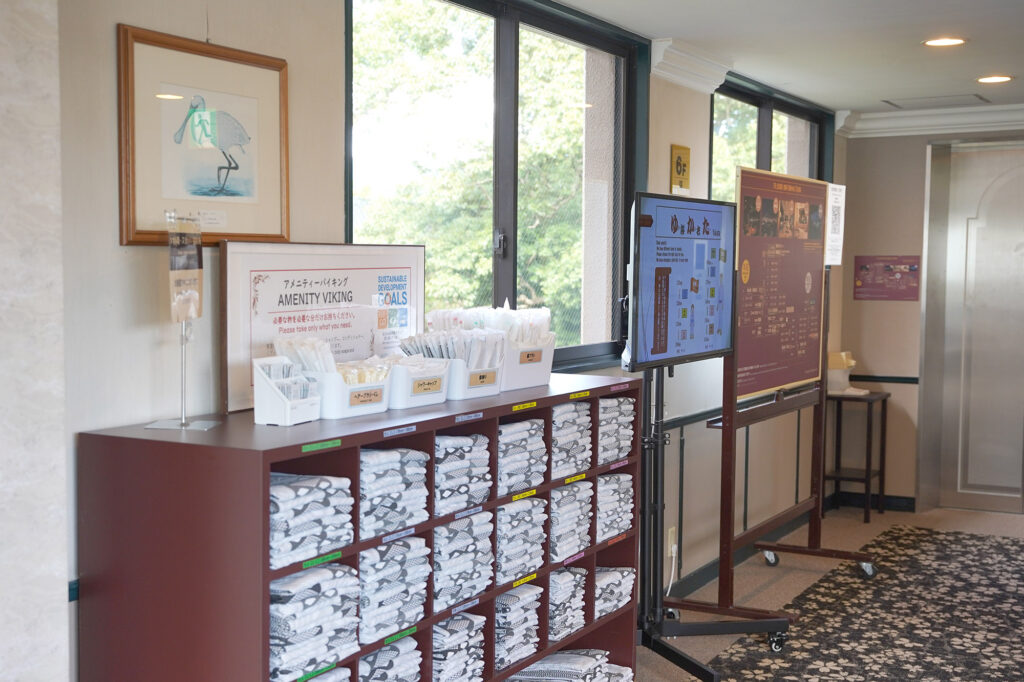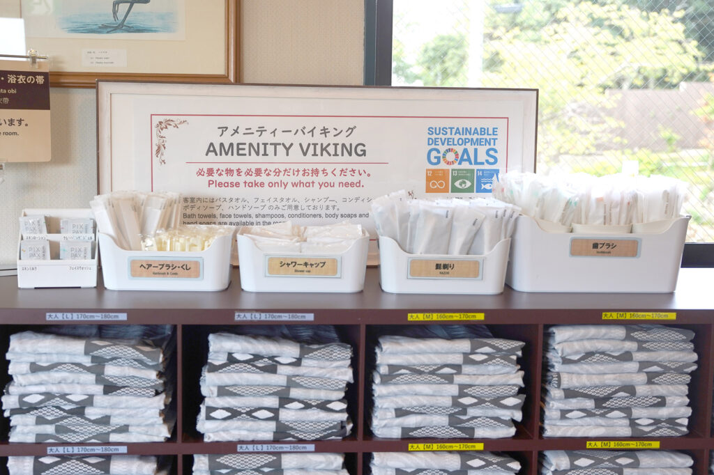 海洋プラスチック削減のため、アメニティを必要なだけお部屋にお持ちいただく「バイキング方式」を導入し、宿泊を通した意識改革にもつなげています。このことは従業員の労働環境の改善にもつながっています。