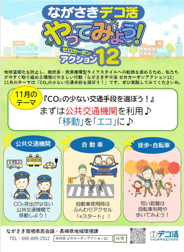 県民、事業者、NPO・大学、行政等で構成する「ながさき環境県民会議」では、地球温暖化を防止し、脱炭素・資源循環型ライフスタイルへの転換を進めるため、私たちが今すぐ取り組める環境にやさしい行動「ながさきデコ活 ゼロカーボンアクション12」をこれから毎月紹介していきます。是非チェックして実践してみて下さいね。